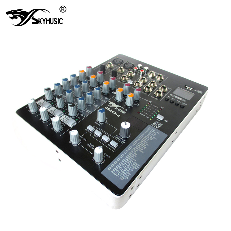 GRACE系列调音台,是SKYTONE 15年新研发的小型迷你调台,其超薄时尚的外观赢得了价多演绎爱好者的睛睐,本款调台为4路防射频干扰线路设计,内置99种DSP效果,带2路辅助,带48V幻像电容麦供电,支持USB/CD/手机多端输入源矩阵,高分辨率6个LED立体声电平灯,失真低于0.0007%(20hz- 50khz),超宽60分贝增益范围,是一款小型演绎,会议,多功能厅等 场合应用非常理想的调台。