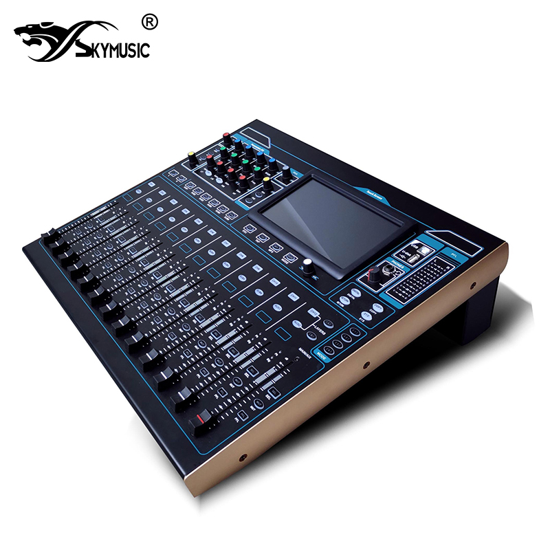 1:20路信号输入(12路MIC输入,两组立体声输入,1组返回输入,1组数字输入:声卡/MP3,光纤输入)