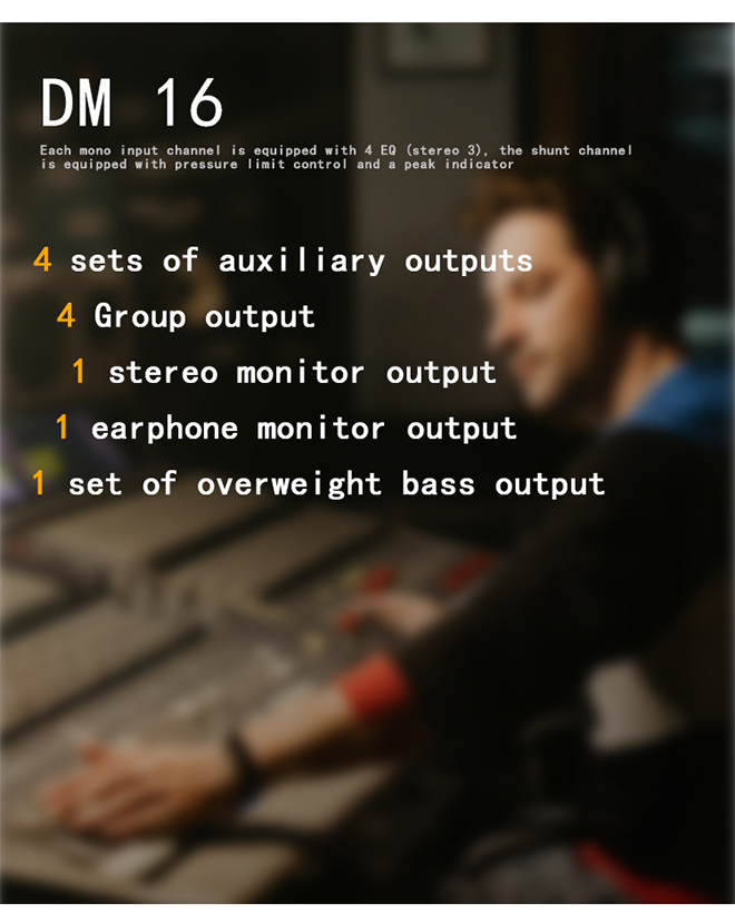 5. Provide 4 sets of auxiliary outputs, 4 sets of outputs, 1 set of stereo monitoring output, 1 set of headphone monitoring output, and 1 set of ultra low frequency output.