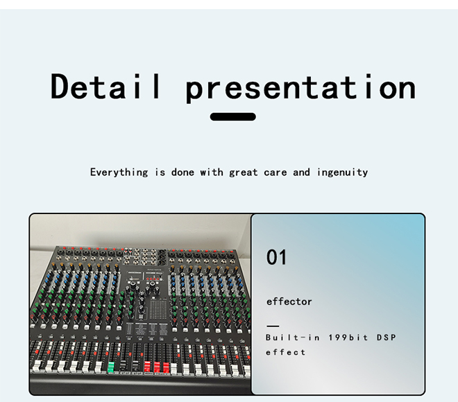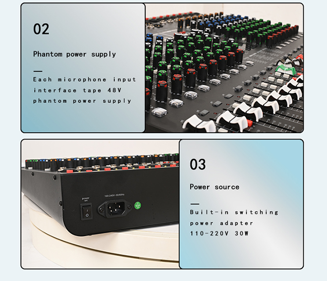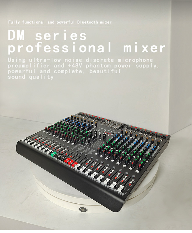 1. Professional Bluetooth style mixing console, equipped with ultra-low noise discrete microphone preamplifier and+48V phantom power supply, powerful and complete functions, and beautiful sound quality.